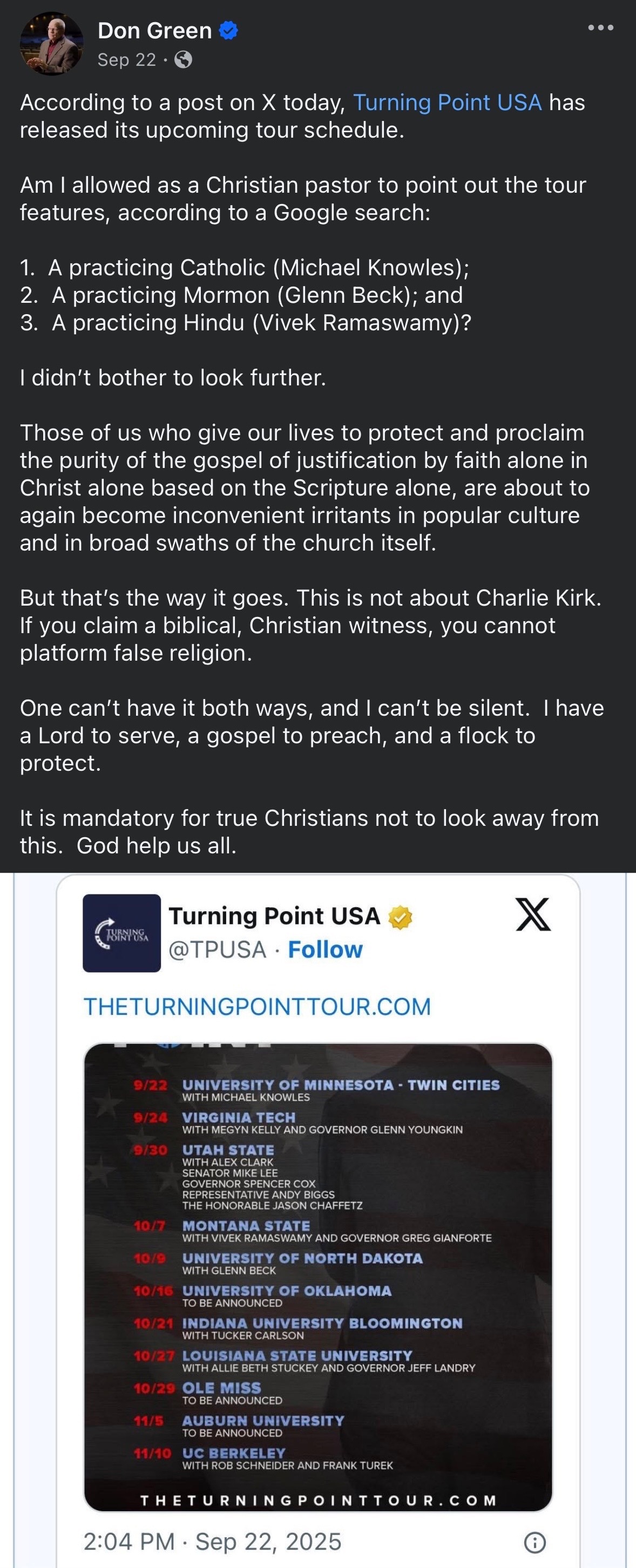 Green’s critique rests on this assertion: “You cannot platform false religion.” But this raises the question—what does platform mean? If he means “share gospel ministry,” we agree. We do not host ecumenical crusades. But if he means “stand in public with a non-Christian to oppose evil,” his definition collapses. Paul co-belligerated with Pharisees in Acts 23:6 to uphold his life through the doctrine of resurrection, even though they denied Christ. He did not thereby validate their entire theology. 2 Cor 6:14–18 teaches that we do not yoke in spiritual fellowship—but that’s not what civil co-belligerence is. Gal 1:6–9 guards gospel purity, not limiting where you earn your living or who you employ at your job to a church’s doctrinal statement. Would Pastor Green and those of his persuasion think it is a sin for a Christian business owner to “platform” a Roman Catholic salesman by hiring him (and paying him of course) to sell a good product in the civil sphere.
